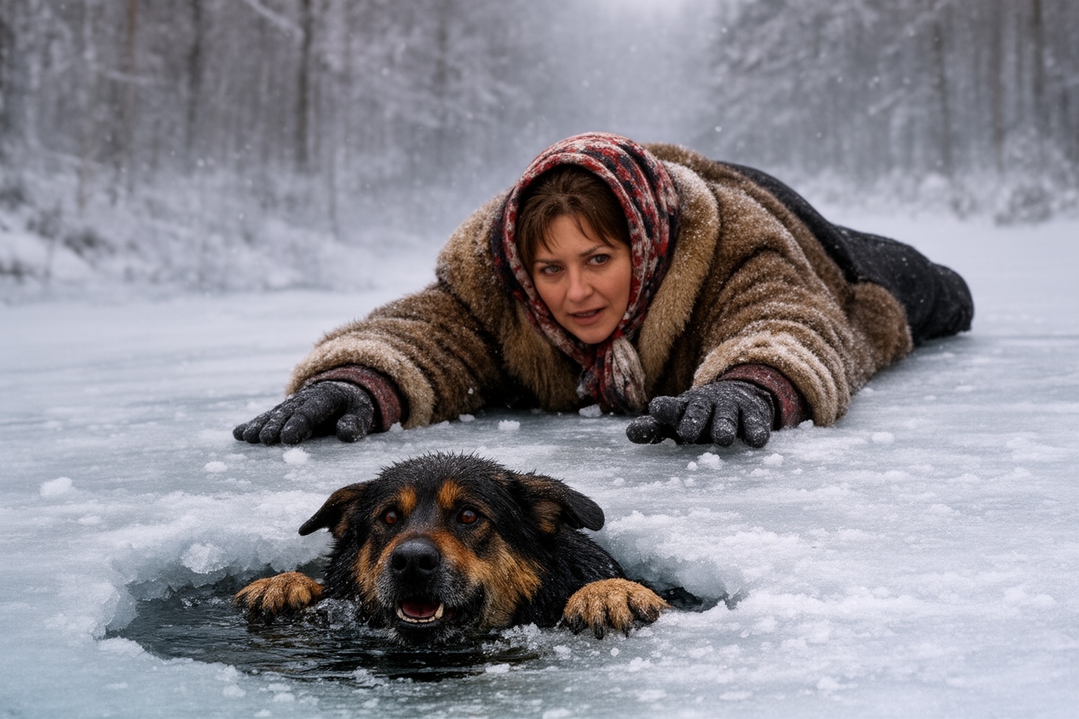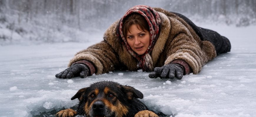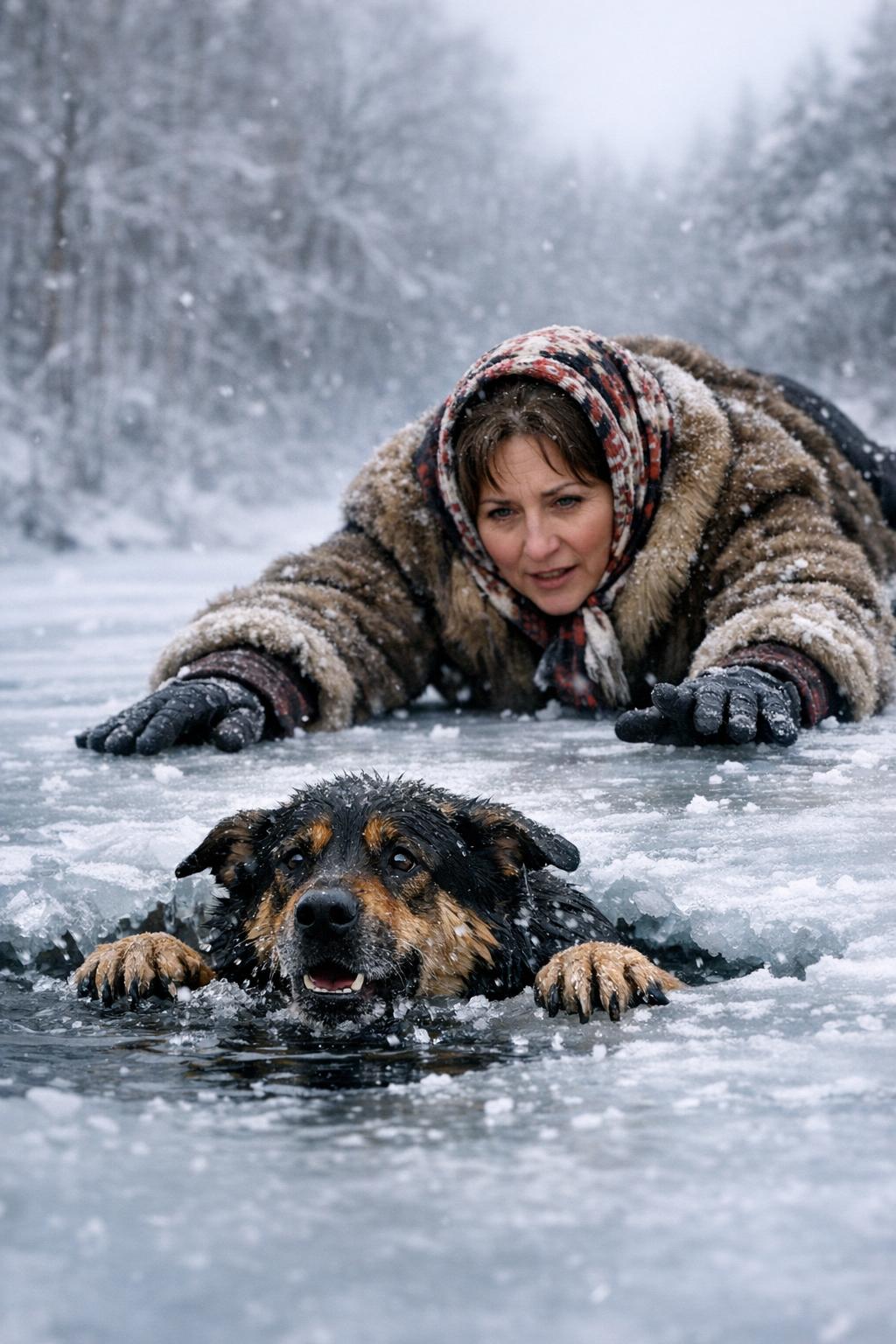Az asszonyban fel sem merült, hogy a bajba jutott lény veszélyes lehet. Nem a félelem vezette, hanem az ösztönös segíteni akarás. Gyorsan keresett egy hosszú, erős ágat, majd hasra feküdt a jégen, hogy súlyát elossza, és lassan, óvatosan araszolni kezdett a lék felé. A jég panaszosan ropogott alatta, de nem állt meg.