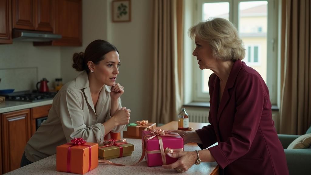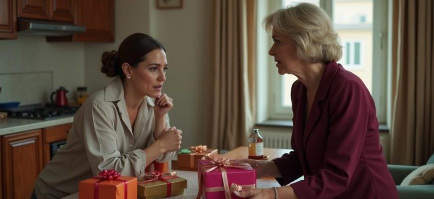 Viktória lassan felemelte a tekintetét a színes ajándékdobozokról, amelyeket éppen sorba tett az asztalon. Az ajtóban Evelina Markovna állt, drága, burgundi vörös ruhában.