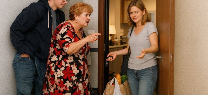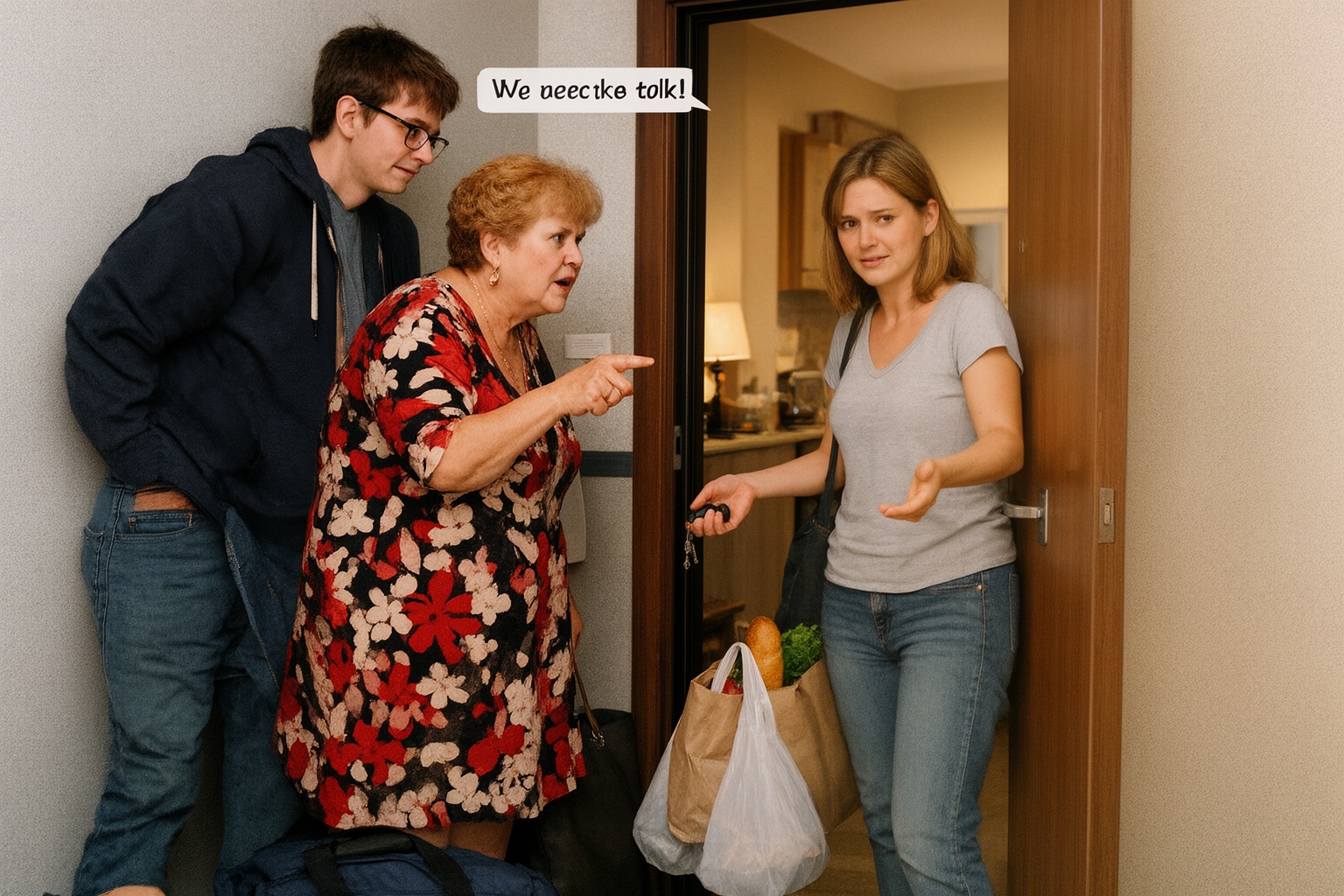 A liftből kilépve, két teli szatyorral a kezében, egy ismeretlen asszonyt pillantott meg az ajtó előtt. Úgy hatvan év körüli lehetett, alacsony, testes, rikító mintás ruhában. Mellette egy magas, sovány fiú álldogált szemüvegben, a lábuknál egy megpakolt utazótáska hevert.