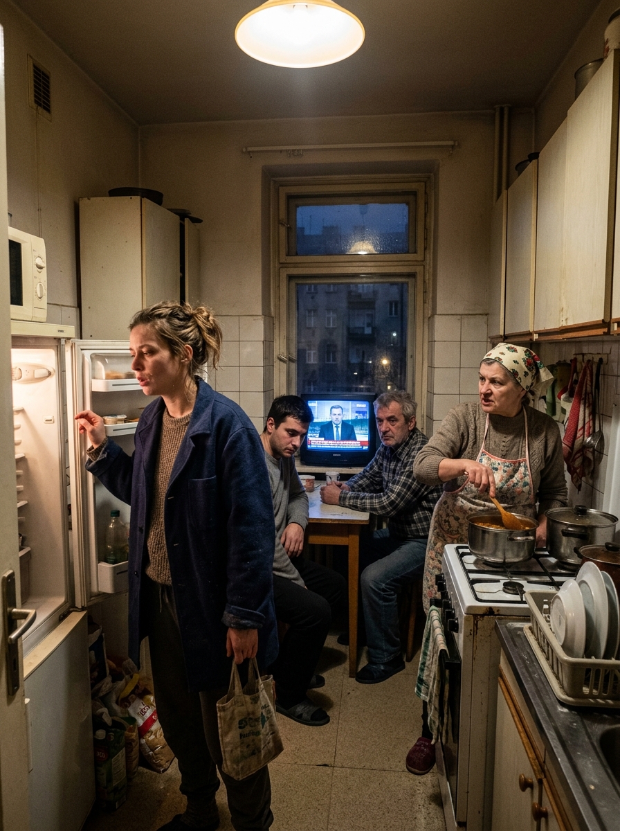 Péter és István az asztalnál ültek, tekintetük a televízióra szegeződött. Erzsébet a tűzhelynél sürgölődött, és feltűnően hangosan pakolta az edényeket.