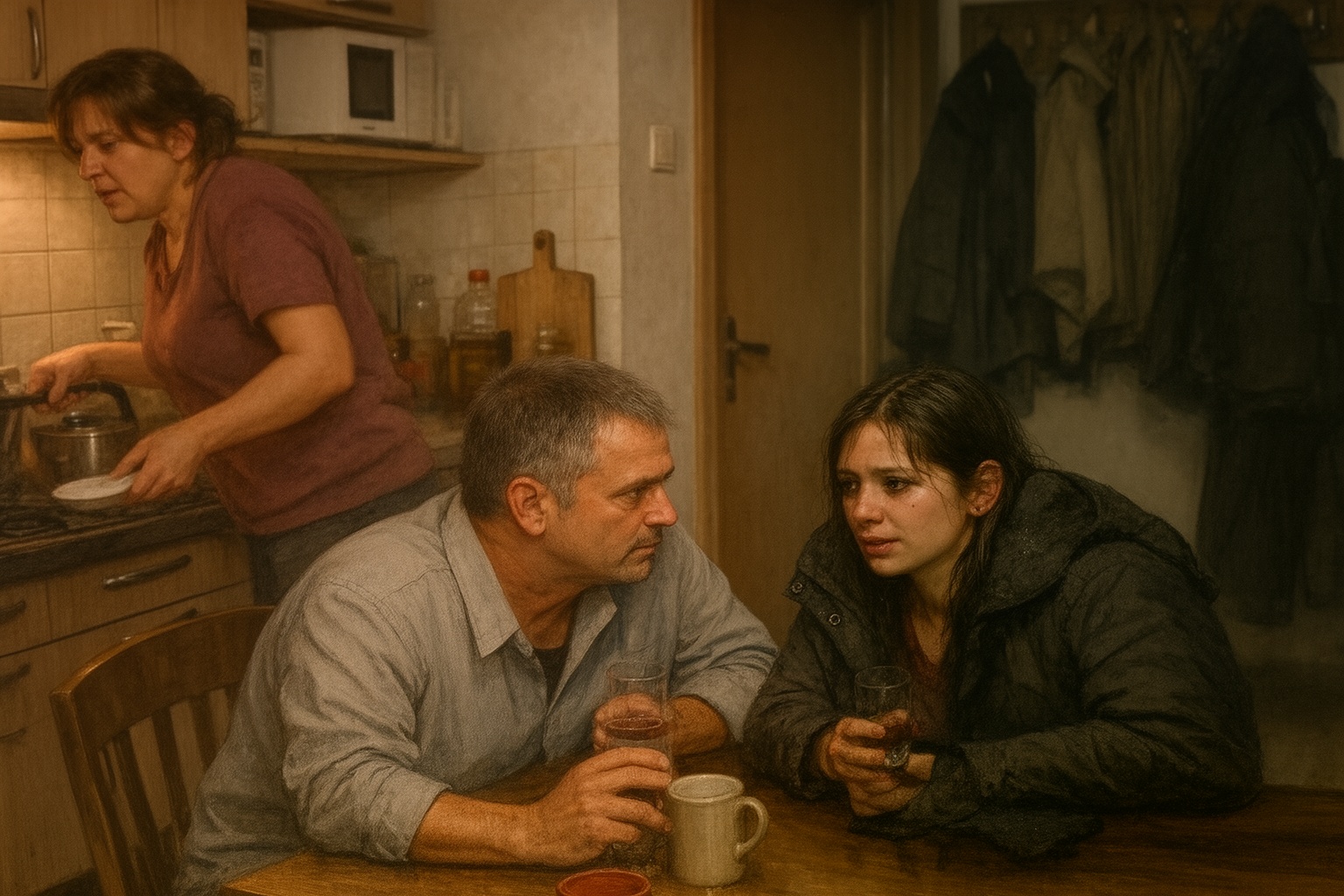 Eszter besietett, lerúgta a cipőjét, és egyenesen a konyhába ment — oda, ahol gyerekkorában minden gond megoldódott. Réka szó nélkül elővette a bögréket, feltette a vizet forrni. Gergő leült a lánya elé, és aggódva fürkészte a kisírt arcát.