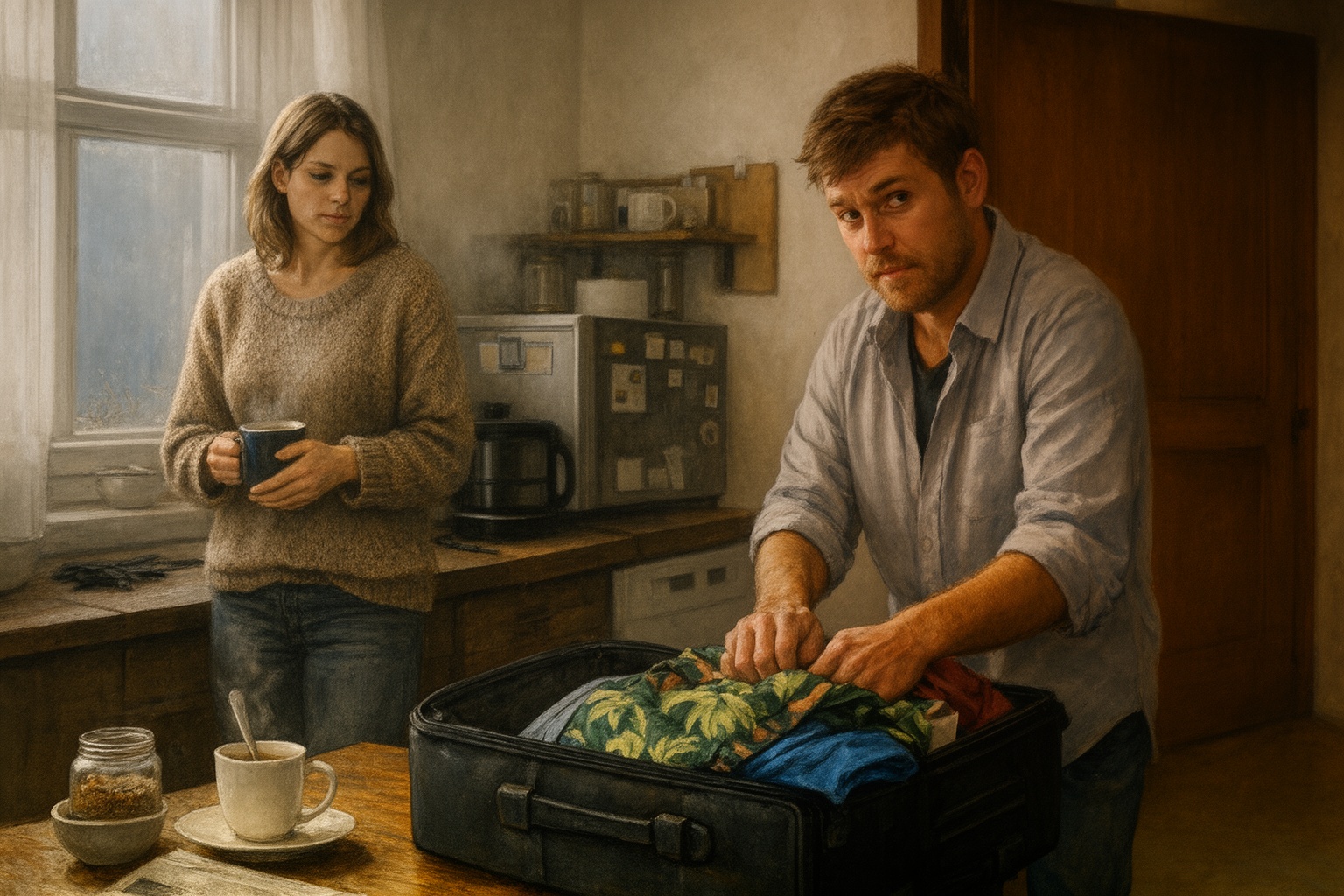 Korán keltem, kávét főztem. A konyhát betöltötte a frissen őrölt szemek illata, amely összekeveredett az ablak résein beszivárgó csípős, téli levegővel. Benedek már az asztalnál ült, a telefonjára meredve. Ujjai türelmetlenül kopogtak a fa lapon, a tekintete fáradt és hűvös volt.