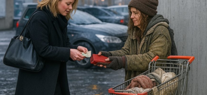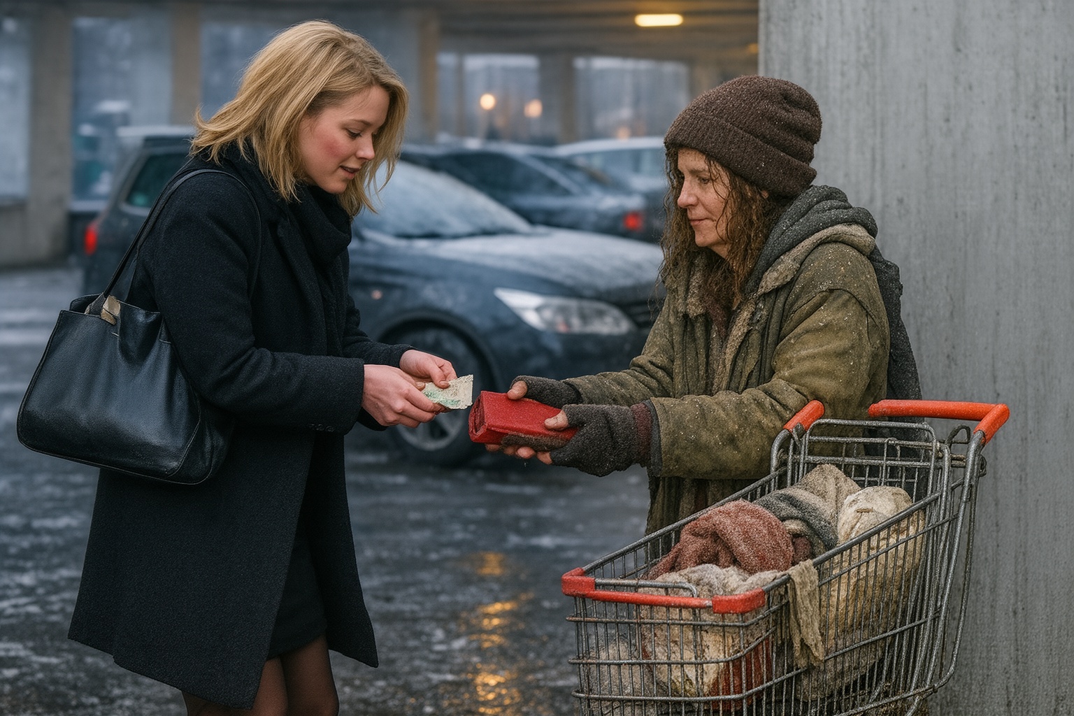 Réka megtorpant, majd hátrafordult. Egy nő állt mögötte. Első pillantásra hajléktalannak tűnt: zsíros, összecsomósodott haja volt, ruhája foltos és elnyűtt, a kezében pedig egy rozoga bevásárlókocsi. Mégis volt benne valami feltűnően szép. Az arca világos és kerek, apró, kissé pisze orral, nagy, babaszerű szemekkel. A kezében egy piros pénztárcát tartott. Réka azonnal felismerte – Márktól kapta tavaly szilveszterkor. Az édesanyja akkor rossz előjelnek nevezte az ajándékot. És valóban: február tizennegyedike után szakítottak.