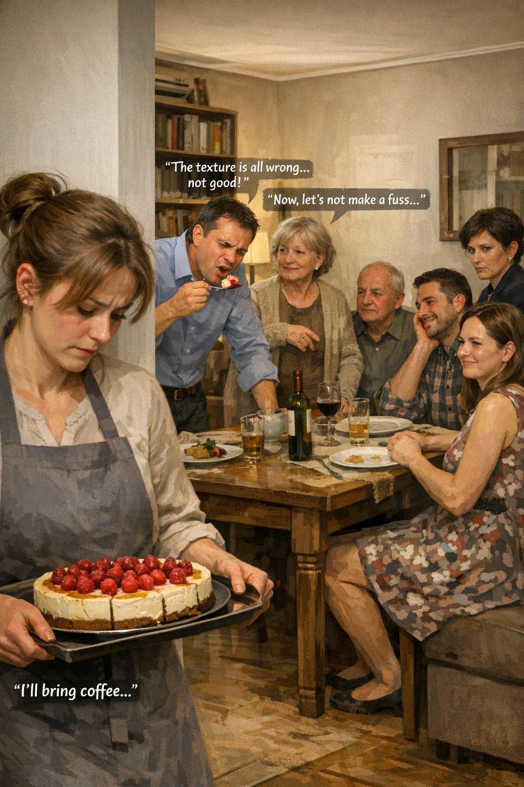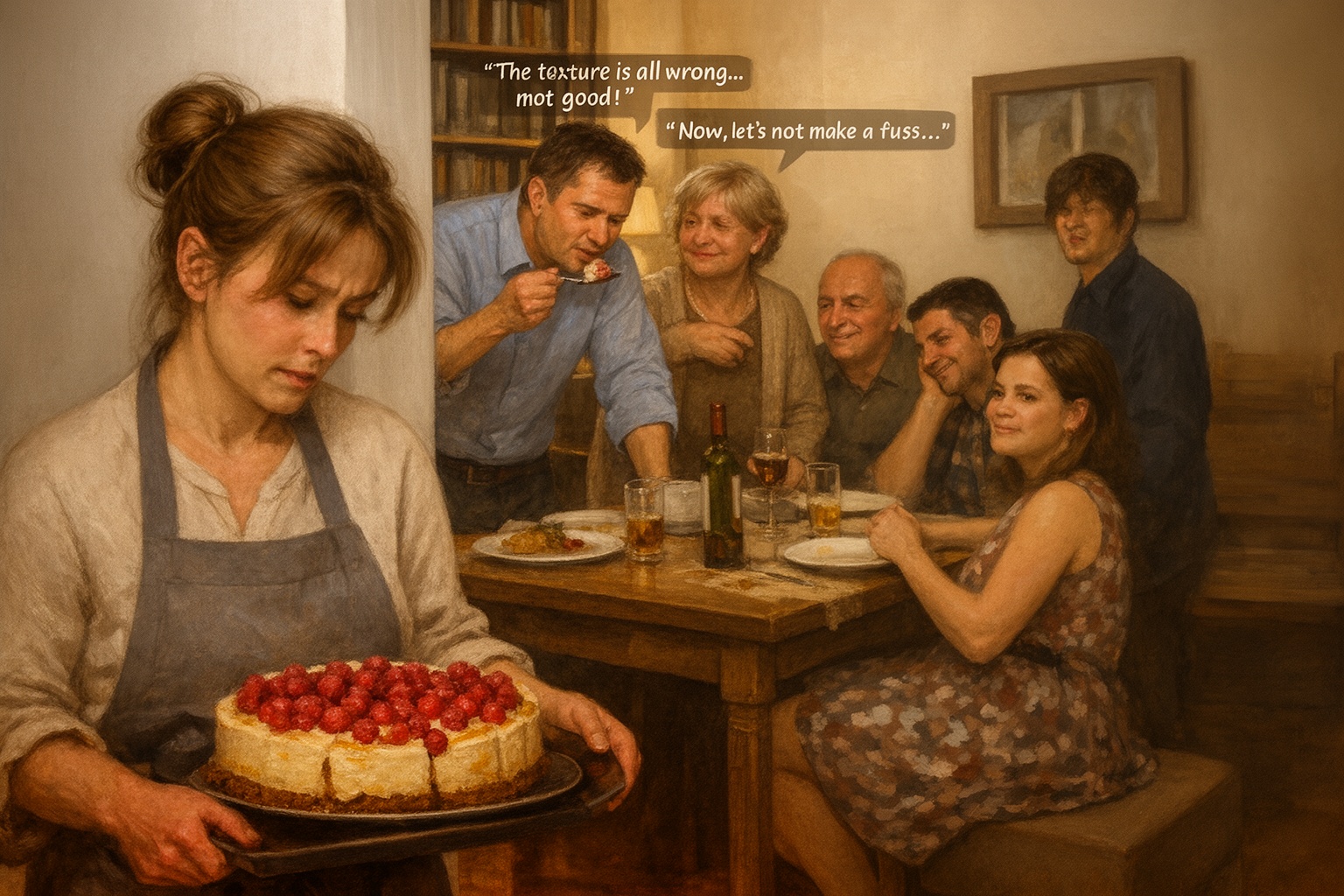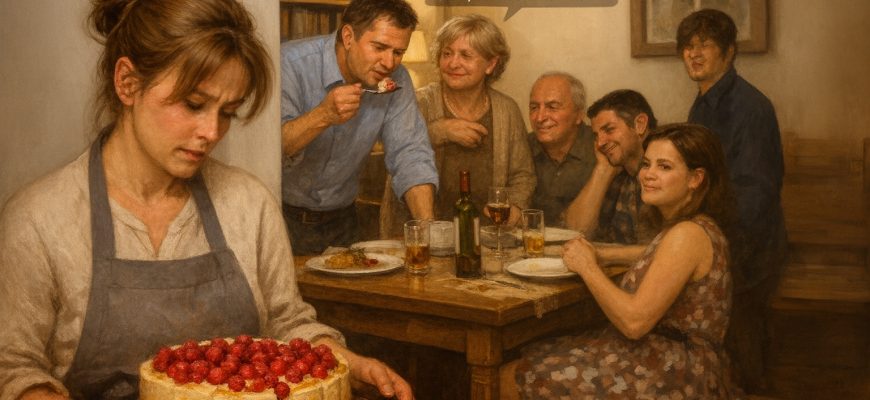 Sietve szeletelem fel a tortát, a tetejére friss málnát szórok. Minden mozdulatom kimért és feszült — rettegek, hogy elrontok valamit. A fejemben újra és újra visszhangzik, amit a legutóbbi családi vacsorán mondott: „Kétbalkezes vagy. Egy egyszerű süteményt sem tudsz rendesen felvágni.”